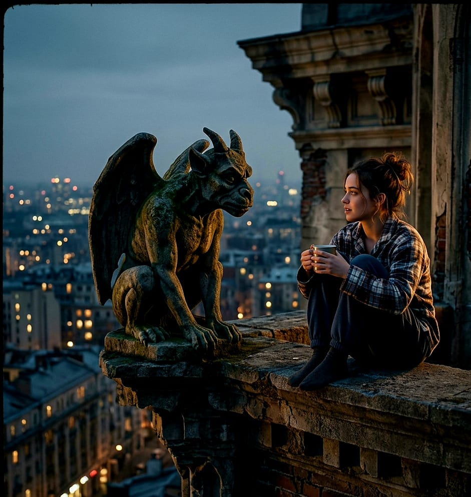 Habrase visto semejante escena, yo: ojerosa, con pijama rota y deslavada, sentada en la cornisa de la azotea de un edificio viejo, peleándome en la madrugada con una gárgola intentando que valide lo que siento, que me entienda, que me abrace y me diga que todo estará bien, cuando lo único que hace es insultarme, burlarse, hablarme sin permiso y restregarme verdades.